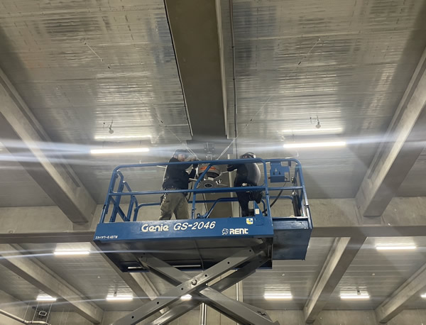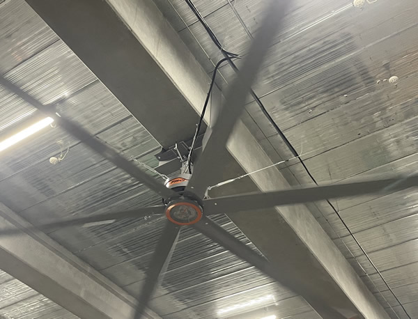 予算の都合でエアコンの導入が難しいお客様の倉庫に、熱中症対策として大型シーリングファンを3台導入しました。1台導入するだけで広範囲に冷却効果があり、更には除湿効果も発揮することで体感温度を下げ、夏場の作業環境の改善を実現しました。