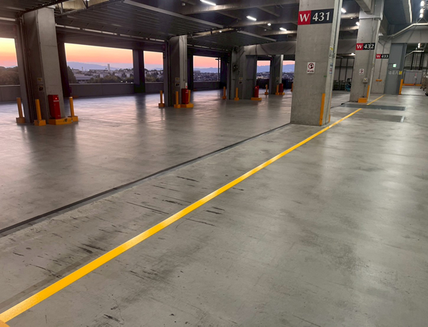 防火シャッター下、消防設備前など消防法に関わる箇所をライン塗装しました。