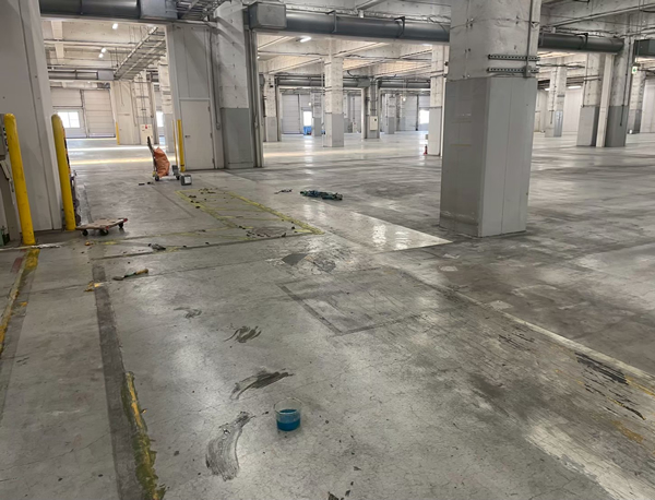 倉庫移転に伴い、1万平米という広大な倉庫の原状回復工事(ポリッシャーかけ、塗装ライン剥離、ケレン作業、表面強化剤塗布)をご依頼いただきました。現場ではマテハン解体工事も進行しており、短工期という厳しい条件でした。そこで他工事との兼ね合いを見ながら綿密にスケジュールを調整し、作業の干渉を防ぎました。また、床の塗装ラインが非常に剥がれにくい状態でしたが、現場で複数の溶剤を試し、最も効果的なものを選定したことで効率よく剥離作業を進めることができました。結果として、限られた期間内で無事に完了できました。