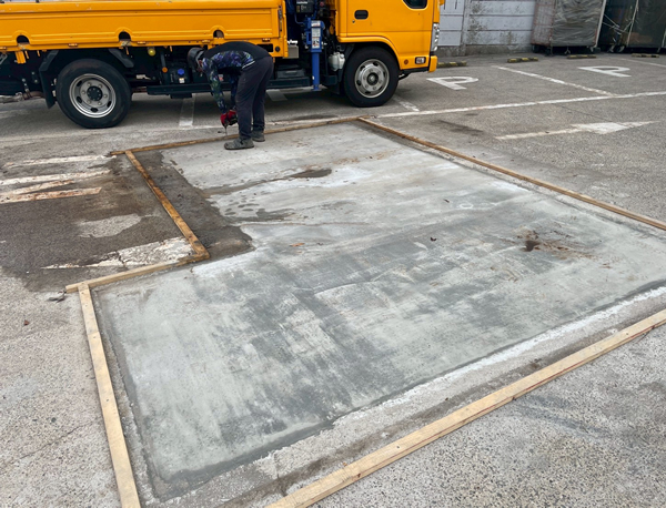 倉庫入り口のアスファルトが大きく沈下し、トラック通過時に大きな揺れが生じていたため、早急な補修工事を実施しました。今後の強度をしっかりと確保するため、アスファルトではなくコンクリートによる埋め直しを行い、安全で頑丈な路面に改善しました。